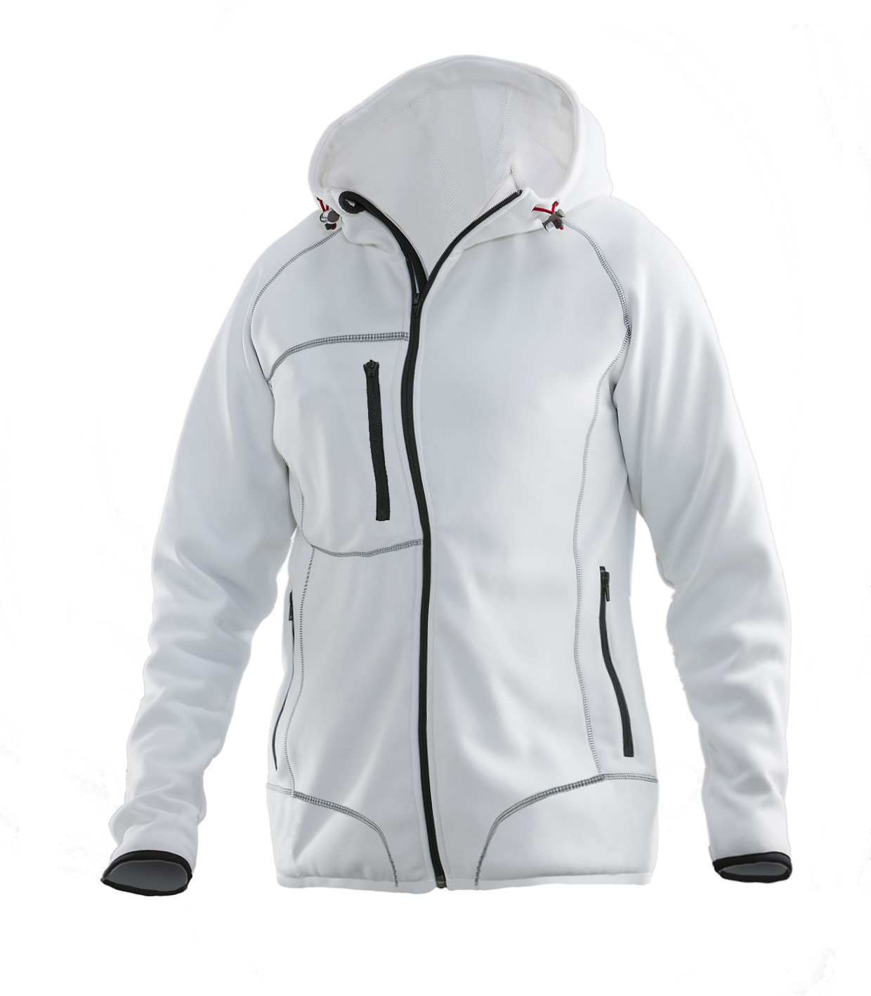 Joustavaa polyesteriä, sisäpinta fleeceä. Vartalonmyötäinen leikkaus lisää liikkuvuutta. Kiristysnauhalla säädettävä huppu ja helma. Tekninen materiaali. Edessä vetoketju ja tuulilista. Säädettävä verkkovuorillinen huppu. Flatlock-saumat. Vetoketjullinen rintatasku, jossa puhelinlokero. Vetoketjulliset sivutaskut. Suuret avoimet sisätaskut.