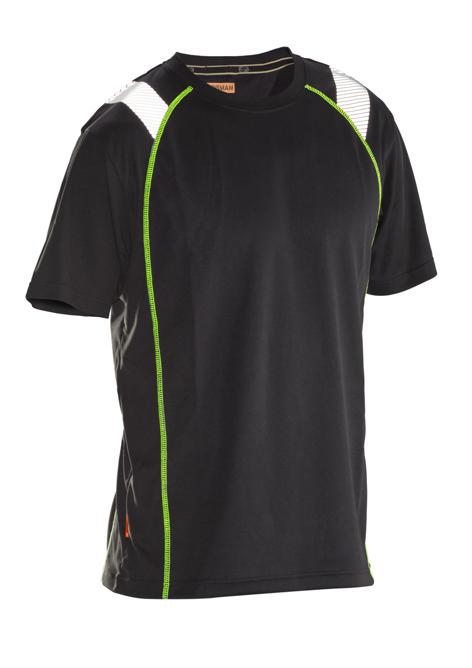 T-paita joustavaa polyesteria, hihat ja sivukappaleet ovat pehmeää interlock-neulosta ja etu- ja takaosa kosteuden siirtävää verkkoneulosta. Spun Dye on ympäristöystävällisempi värjäysmenetelmä, jossa käytetään vähemmän vettä ja joka säästää energiaa sekä vähentää valmistuksessa käytettävien kemikaalien määrää. Fluoresoivat flatlocksaumat ja heijastimet olkapäillä parantavat näkyvyyttä.