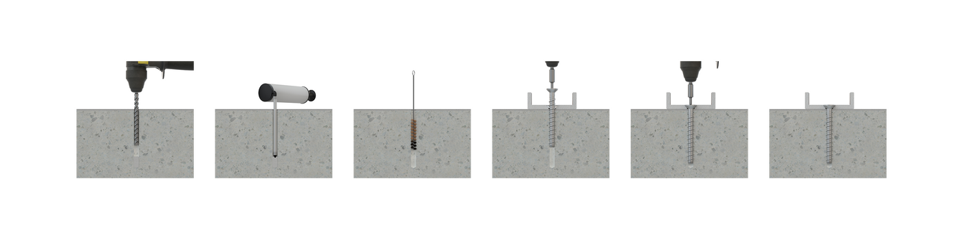 Kierrä betinoruuvi betoniin, kunnes uppokanta asettuu tasaisesti kiinnitettävää osaa vasten. Ruuvi on asennettu oikein, kun se on napakasti paikallaan eikä liikettä jää.