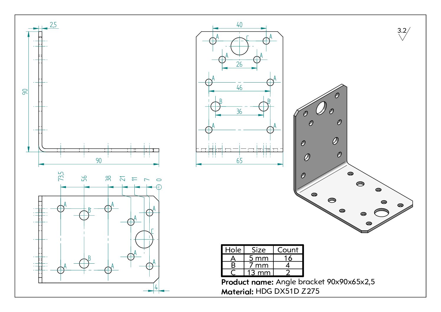 Kulmalevy 90x90x65x2,5 JVT Fasteners tekniset tiedot