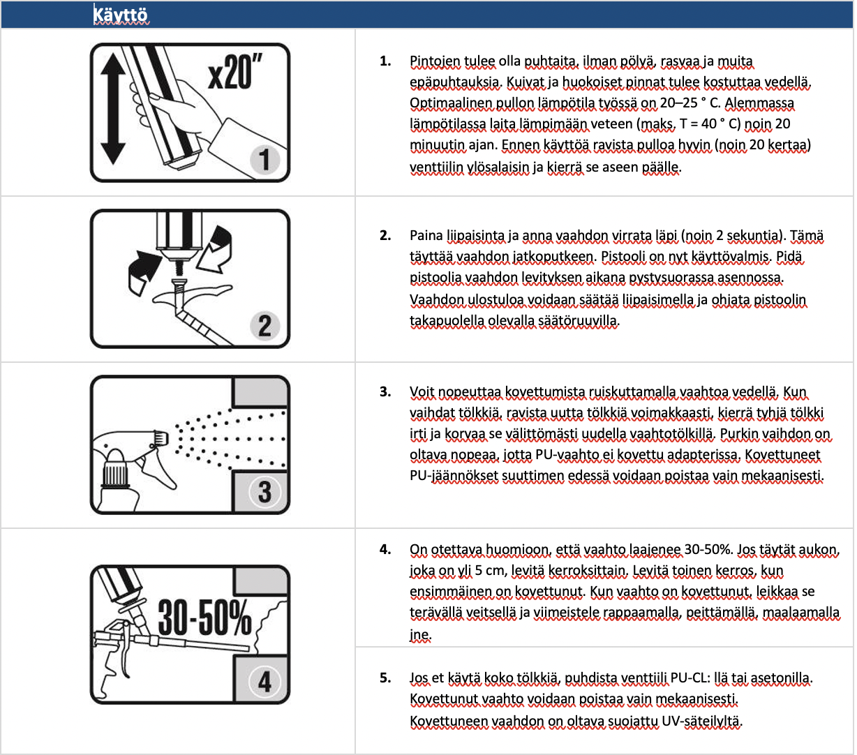 • Puhdista pistooli ja tuore vaahto PU-CL puhdistusaineella heti käytön jälkeen.