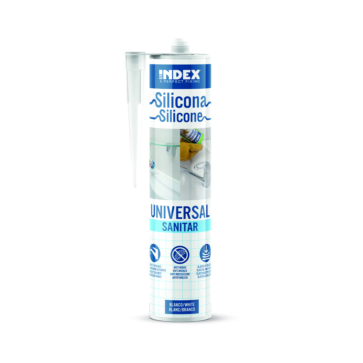 – Saniteettisilikoni saatavana valkoisena ja läpinäkyvänä